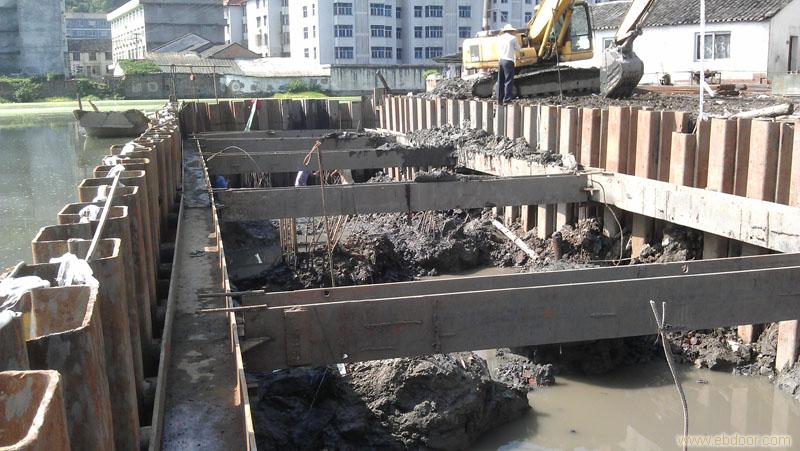 (7)在基础沟槽开挖过程中,随时观察钢板桩的变化情况,若有明显的倾覆或隆起状态,立即在倾覆或隆起的部位增加对称支撑。
