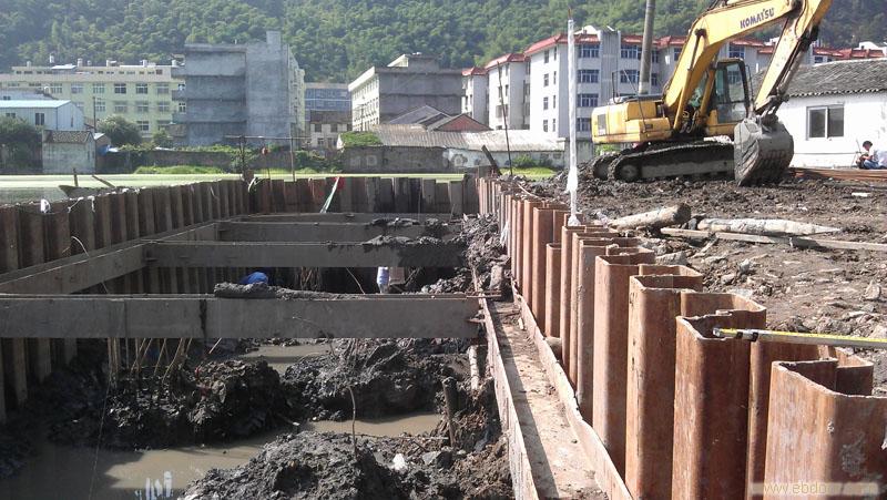 7)在基础沟槽开挖过程中,随时观察钢板桩的变化情况,若有明显的倾覆或隆起状态,立即在倾覆或隆起的部位增加对称支撑。