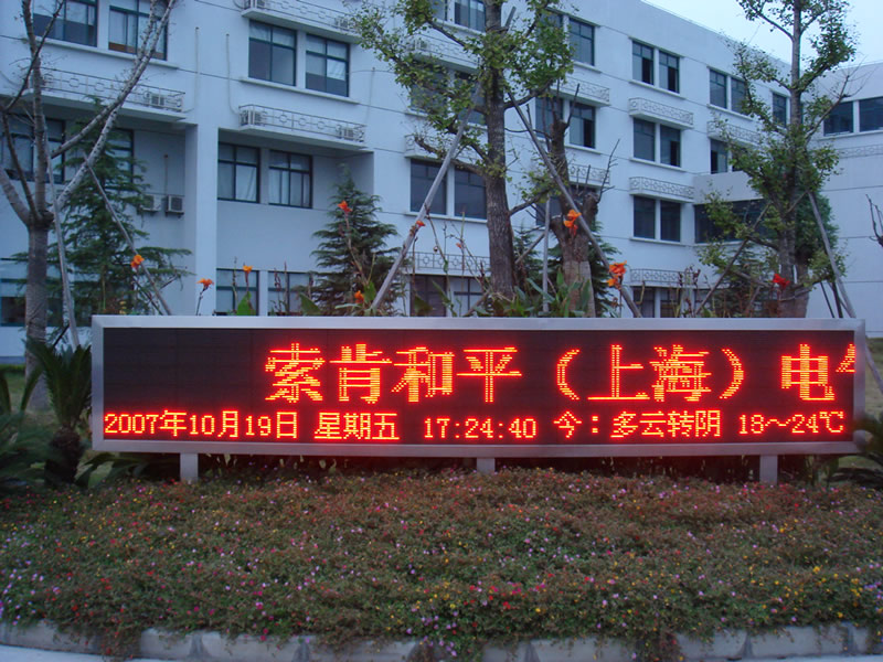 我公司室外单色LED显示屏,可显示各种图形、文字等信息。表面平整、显示均匀、发光亮度好、显示效果清晰稳定, 配有十几种循环变化方式。采用远距离串行通讯,可脱机运行,具有掉电保护功能。全部采用高亮度LED发光点二级管和进口元器件组装生产。具有高亮度、宽视觉、长寿命、重量轻、模块化结构、安装方便、易于维护等特点。