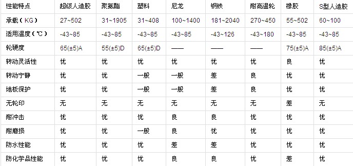 4、车轮材质软硬的选择:通常车轮有尼龙轮、超级聚氨脂轮、高强度聚氨脂轮、高强度人造胶轮、铁轮、打气轮。超级聚氨脂轮、高强度聚氨脂轮不论在室内室外的地面行驶,都能满足你的搬运要求;高强度人造胶轮则能适用于酒店、医疗器械、楼层、木地板、瓷砖地面等要求行走时噪音小宁静的地面上行驶;尼龙轮、铁轮适用于地面不平或地面上有铁屑等物质的场地;而打气轮则适用于轻荷重及路面软不平坦的场合。