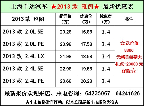 近日,笔者从上海地区经销商了解到,目前雅阁全系优惠3.4万元,仅售16.88万元,另外还送一些装潢大礼包(汽车贴膜、坐椅、GPS导航、全车封釉、倒车雷达、防盗报警器、油卡、指定保险等任由你搭配)。具体各款车型的报价及优惠情况请参照下表。汽车报价行情实时更新,文中价格仅作为近期上海地区的售价参考,敬请关注!