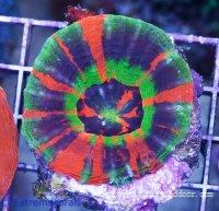 甜甜圈珊瑚也叫葡萄蓟珊瑚。近圆形,单体。颜色丰富,包括暗绿色、红色、褐色、黄色及紫蓝色,杯形、碟形及其他形状。不是很凶猛,但要与其他珊瑚保持足够的空间,因为其触须伸展很长。