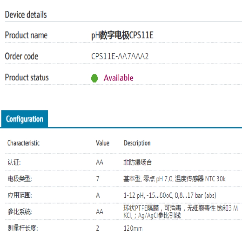 2.0数字技术,具有良好的防潮性能,支持实验室标定,提高了过程安全性,操作使用更加便捷。扩展存储单元中保存标定参数和过程参数,是预维护策略实施的有力支持。Memosens CPS11E电极具有长使用寿命,维护工作量低,性价比非常高。