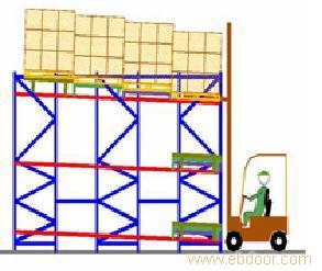 由重型托盘式货架演变而成,采用轨道和托盘小车相结合的原理,轨道呈一定的坡度(3°左右),利用货物的自重,实现托盘货物的先进后出,同一边进同一边出,适用于大批量少品种的货物储存.