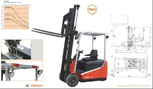 FE3R16AC三支点叉车适合于狭窄通道和有限空间的作业,具有高起升、高承载能力、转弯半径小的特点,是仓库、超市、车间内装卸和堆垛的理想工具。