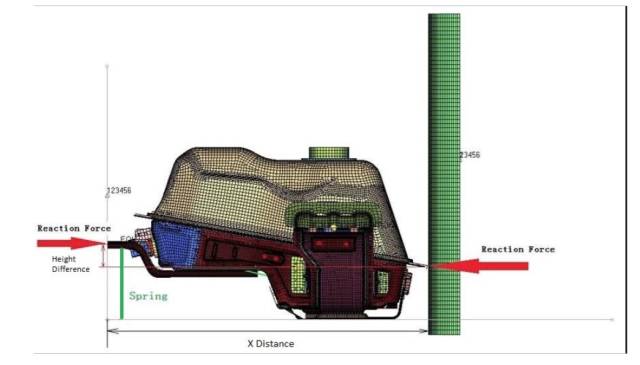 由于在本次计算中,Y 向没有不平衡力矩,因此只需要调整 ZMP 的 X 坐标。为了尽可能小的约束模型,同时达到抑制电池包在挤压中翻转的问题,采用刚度较小的 SPRINGA单元连接电池包前端位置,如图 3 所示,其刚度的简略计算公式如下: