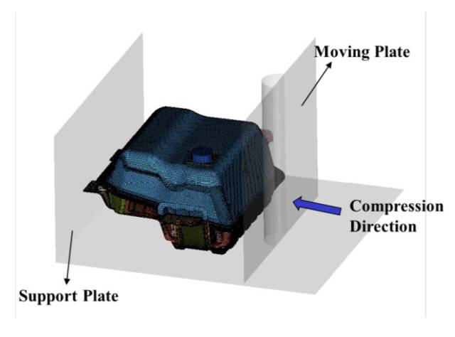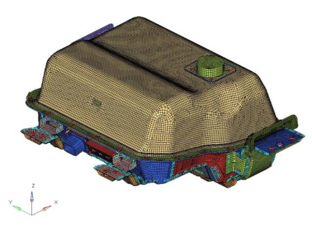 本分析的目的就是通过计算机仿真的方法检验电池包是否可以满足国标对电池包挤压性能的要求。在动力驱动系统开发早期,对电池包的抗挤压特性进行合理的评估和改进可以减少设计周期,降低风险,保证电池包能满足安全性能的要求,同时保证零件的局部强度性能。
