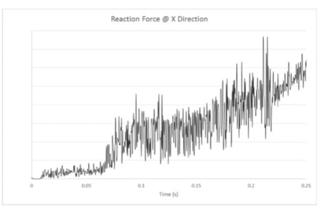 图 9 为电池包在挤压过程中挤压板上的支反力时间历程,可以看出支反力在挤压初期处于比较小的阶段,这主要是在挤压初期,变形位置主要发生在与挤压板接触的支架上,刚度较低。