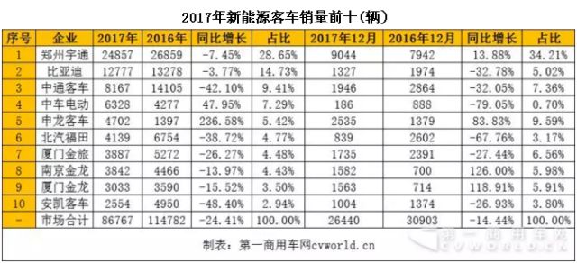 统计数据显示,2017年全年,国内销售新能源客车86767辆,同比下降24.41%,其中排名前10家企业累计销售74286辆新能源客车,占比85.62%。从累计增长率来看,前10家企业只有1家实现了正增长,就是申龙客车。其2017年全年销售新能源客车4702辆,同比大增236.58%,拔得行业头筹,市场占有率超过5%。
