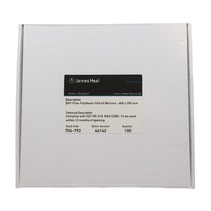 QUALITY ASSURED CONSUMABLES JAMES H.HEAL DESCRIPTION BHT-Free Polythene Film-63 nicrons thick TECHNICAL DESCRIPTION -400*200mm - per box(100) To be used within 12 months of opening. Complies with EN ISO105-X18:2007 & M&S C20B STOCK CODE:706-792 BATCH NUMBER:14640 UNIT OF MEASURE:PK100 确定由于氧化氮与易变黄的石碳酸发生反应而导致纺织物或纱线变色的情况