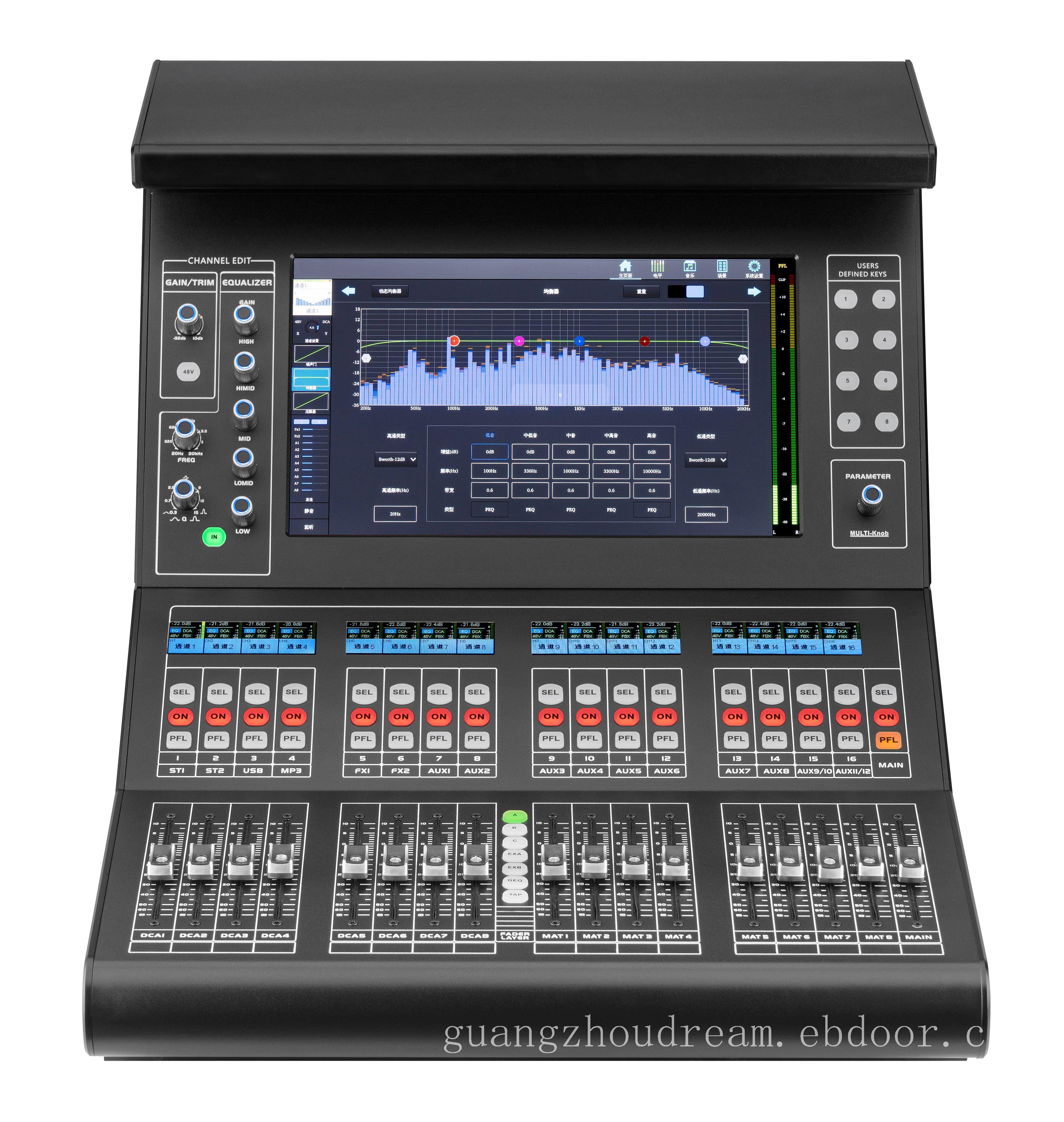产品参数 ■13.3寸高清触控1280*800分辨率,基于Linux操作系统开发。 ■20路输入信号:16路MIC/Line输入,2组3.5立体声输入, 1路数字输入:AES/声卡,MP3 ■MIC输入数字增益调节,通道独立+48V幻象供电 ■输入内置噪声门,压缩器,高低通,5段参量EQ均衡,延时,声像调节 ■17个100mm电动推杆,8个DCA,8个静音编组,8个矩阵 ■16路输出(主输出L,R,10路AUX,1路耳机监听,AES输出) ■输出处理:高低通滤波,15-31段参量EQ均衡,压缩器,延时,相位 ■双USB接口,内置声卡(U盘MP3、PC直接播放录音) ■4个快捷场景调用模式,100个场景存储调用,支持U盘导入导出 ■内置两路双DSP数字效果器,预设100种效果模式 ■集成自动混音,回声抑制消除以及通道独立反馈抑制 ■支持RS232、TCP中控控制,开放中控协议代码 ■支持国产麒麟操作系统软件控制,以及安卓,ios,Window软件控制