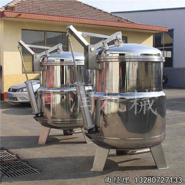 粽子煮锅设计理念: 1、利用盘管循环间接加热,使锅内温度更均匀。 2、蒸煮出料时国内汤汁不需要取出,可连续使用,节约的能源。 3、锅体外部用保温层保温,避免锅内热量散失及人员操作时高温烫伤。 4、锅门结构改过去法兰式螺栓连接固定式为液压快开式。并安装的光电限位、连锁、互锁功能。 5、锅门为充气密封,在锅上限水位安装透视镜便于及时补充汤料。 6、多台设备公共一台液压站,操作时可单一操作,节省空间降低成本。