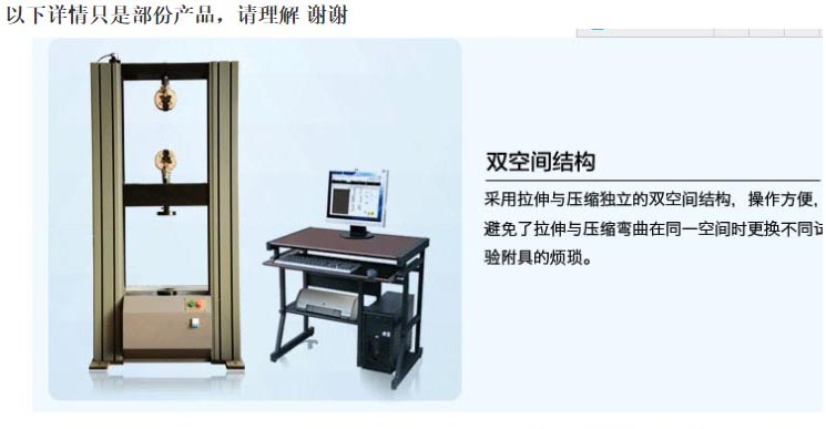 材料试验机功能特点:可对橡胶、塑料、塑胶、薄膜、纺织、尼龙、纤维、纳米材料、高分子材料、复合材料、包装带、纸张、电线电缆、光纤光缆、安全带、保险带、皮革皮带、鞋类、胶带、聚合物、弹簧钢、轴承钢、不锈钢(及其它高硬度钢)、铸件、钢板、钢带、有色金属、汽车零部件、合金材料及其它非金属材料和金属材料进行拉伸、压缩、弯曲、撕裂、90°剥离、180°剥离、剪切、粘合力、拔出力、延伸伸长率等试验。