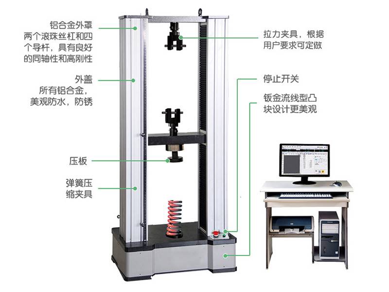 环形弹簧拉压试验机采用电动加载减速系统减速后带动精密滚珠丝杠副加载,实现了数据采集和控制过程的全数字化调整。能对拉簧、压簧、碟簧、塔簧、板簧、卡簧、片弹簧、复合弹簧、气弹簧、模具弹簧、异形弹簧等精密弹簧的拉力、压力、位移、刚度等强度试验和分析。本机无污染、噪音低,效率高,具有比较宽的调速范围,完全符合国家及国际相关标准的要求。
