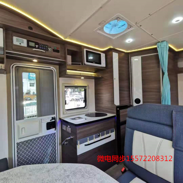 厨房区由车内和车外两部分组成,车外专用防风抽拉灶台,不用担心车内烹饪产生油烟.车内厨台上装有电磁炉和翻盖式洗菜池,下方是厨具储物柜,上方是带栅栏储物格和微波炉.12V110L车载冰箱和900*500*480MM的衣柜位于一旁.威尔特芬依维柯自动挡房车多少钱