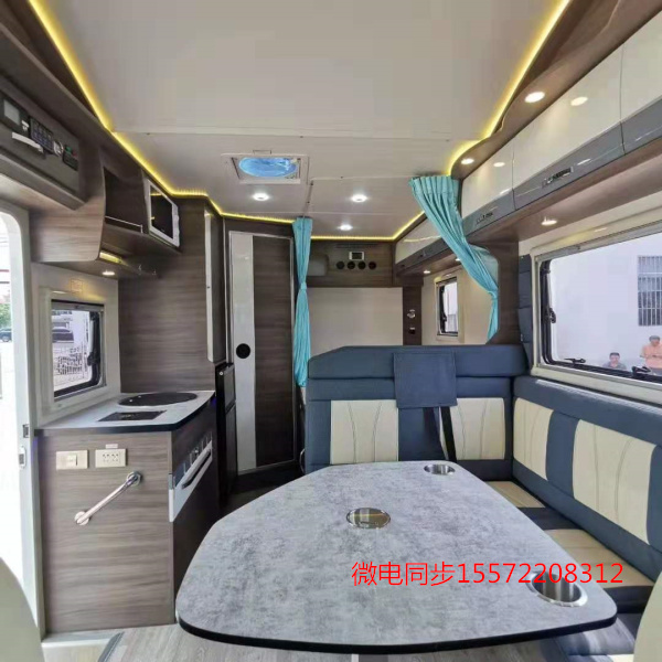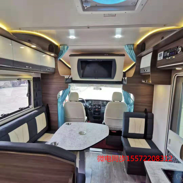 进入车内,可以看到车内的板材和灯光均有升级,整体更加明亮,给人耳目一新之感.会客区由L型沙发座椅,850*850MM的升降桌和对侧独座椅构成.其中升降桌可选换成麻将机,车辆行驶时也不无聊.副驾驶座椅可360度旋转,参与进会客区一同娱乐.需要休息的时候,降下升降桌,可与L型沙发拼成1750*1150MM的床铺.为方便使用,座椅侧面设置有暖风出风口,12V直流电源口,插座,暖风开关.威尔特芬依维柯自动挡房车多少钱