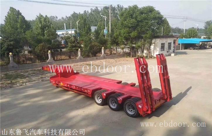 低平板半挂车后尾部选装有手动或弹簧自动爬梯,便于运输工程机械或大型设备。3.2悬挂 悬挂系统分为双桥或三桥平衡式钢板弹簧悬挂,用来支承负荷,并有吸收行车振动等作用。,钢板弹簧用u形螺栓紧固在车轴轴体上,两端卡在车架支架中。中支架上的钢板弹簧用可摆动的平衡梁连接。主要用来承受车架上垂直方向的重力。水平方向作用力由支架、连杆、拉杆及车轴上的托架传递。所以当半挂车通过不平路面时,平衡梁随着车轴一起跳动而摆动,从而使各轴的负荷在一定的范围内得到平衡。