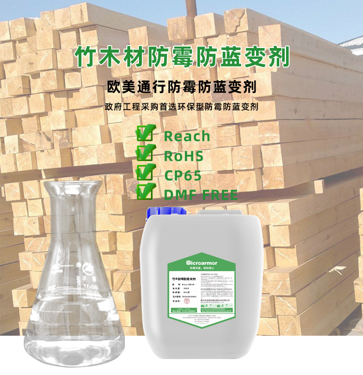 竹木材防霉防蓝变剂是由多种防霉剂复配而成,主 要用于解决木材、竹材、秸秆、草编、藤编等制品 的防霉、蓝变问题。该药剂不仅对常见污染霉菌具 有优异的杀灭抑制作用,同时还对球二孢属、色二 孢属、长喙壳属等蓝变真菌具有很好的抑制能力。 能够预防因发霉、蓝变引起的产品价值损失,让客 户避免遭到经济损失,延长制品的使用寿命。本产 品全部采用安全环保防霉剂,规定使用范围内无毒、 无刺激。