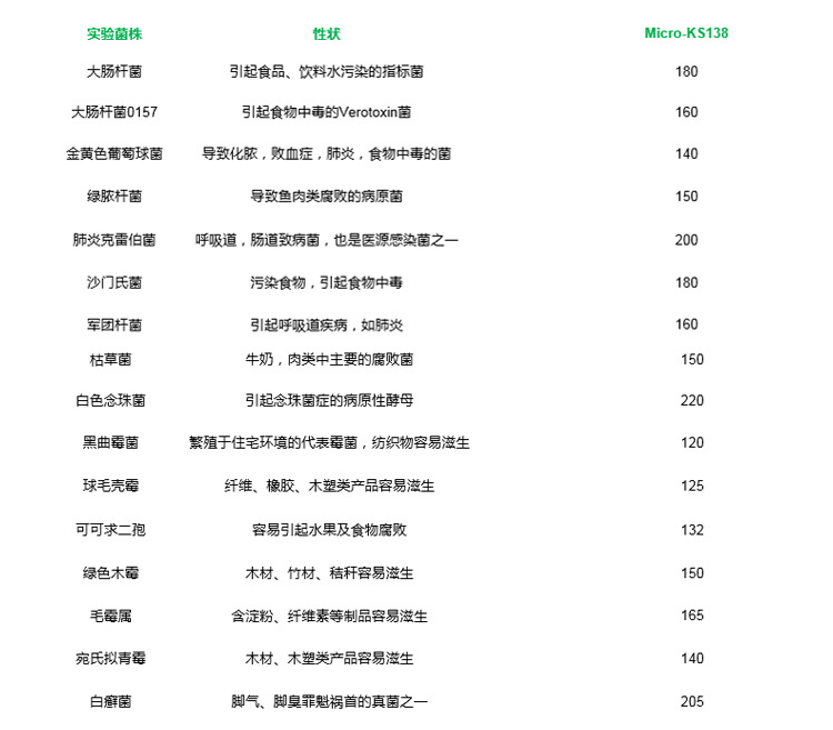 Micro-KS138对于常见微生物菌类都有很好的抑菌效果。下表列出了Micro-KS138对各种微生物的最小抑制发育浓度(MIC),MIC是阻止细菌分裂、繁殖所需抗菌剂的最小浓度。即MIC的数值越低对此细菌的抗菌效果越好。