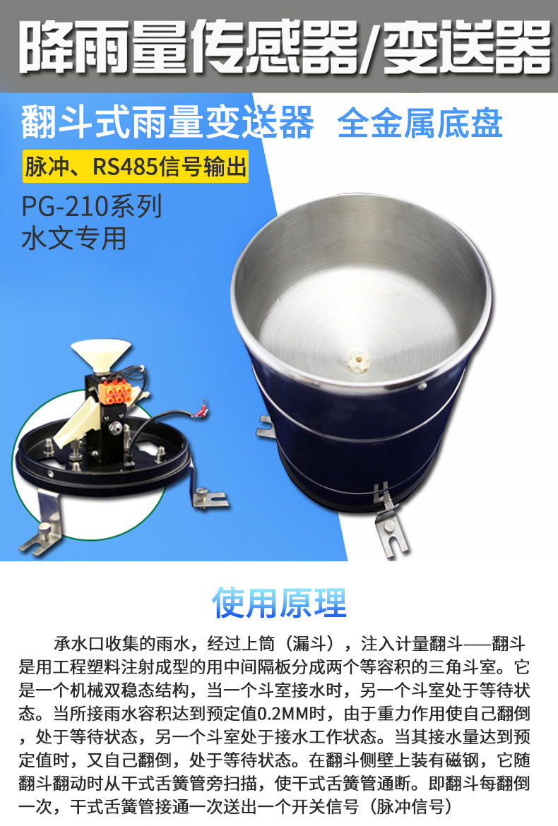本仪器属翻斗式雨量传感器,可用于气象站,水文站,农林等有关部门,用来测量降水量,降水强度,降水时间等。