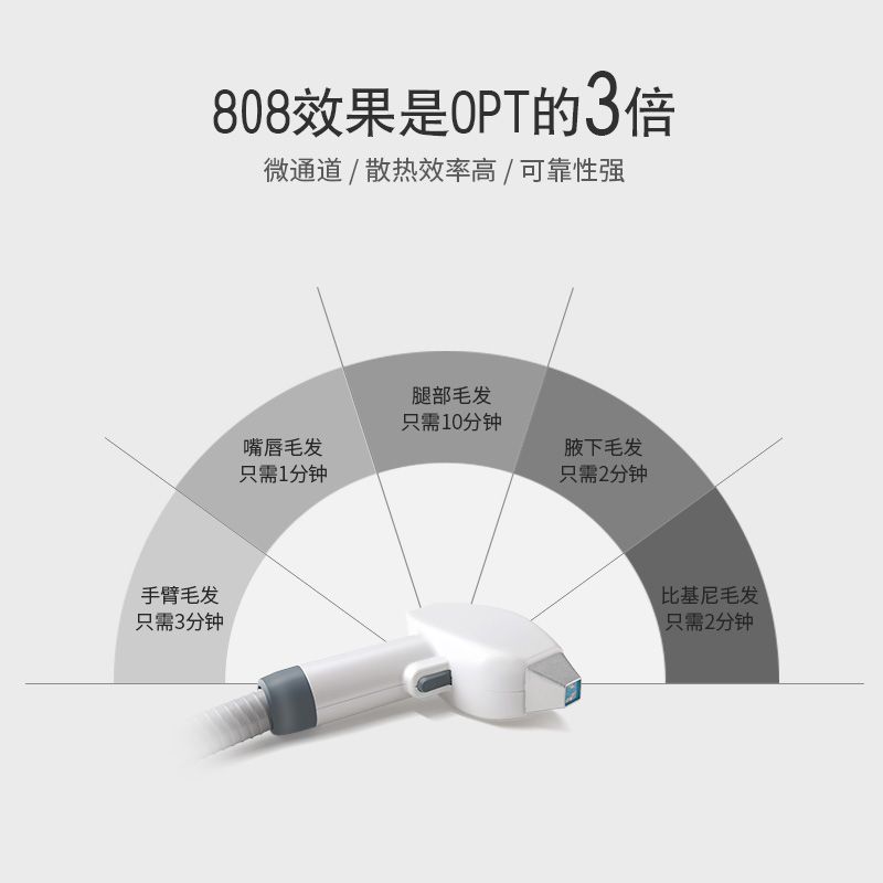 脱毛就是破坏毛囊,OPT的光是640波段,对毛囊的破坏不够彻底,所以才要8次左右才能脱毛,如果功率不够的OPT,8次都不能脱掉毛。808NM的波段是对皮肤伤害最小,毛发吸收光的效果,损伤毛囊彻底,所以3-5次就绝毛了。