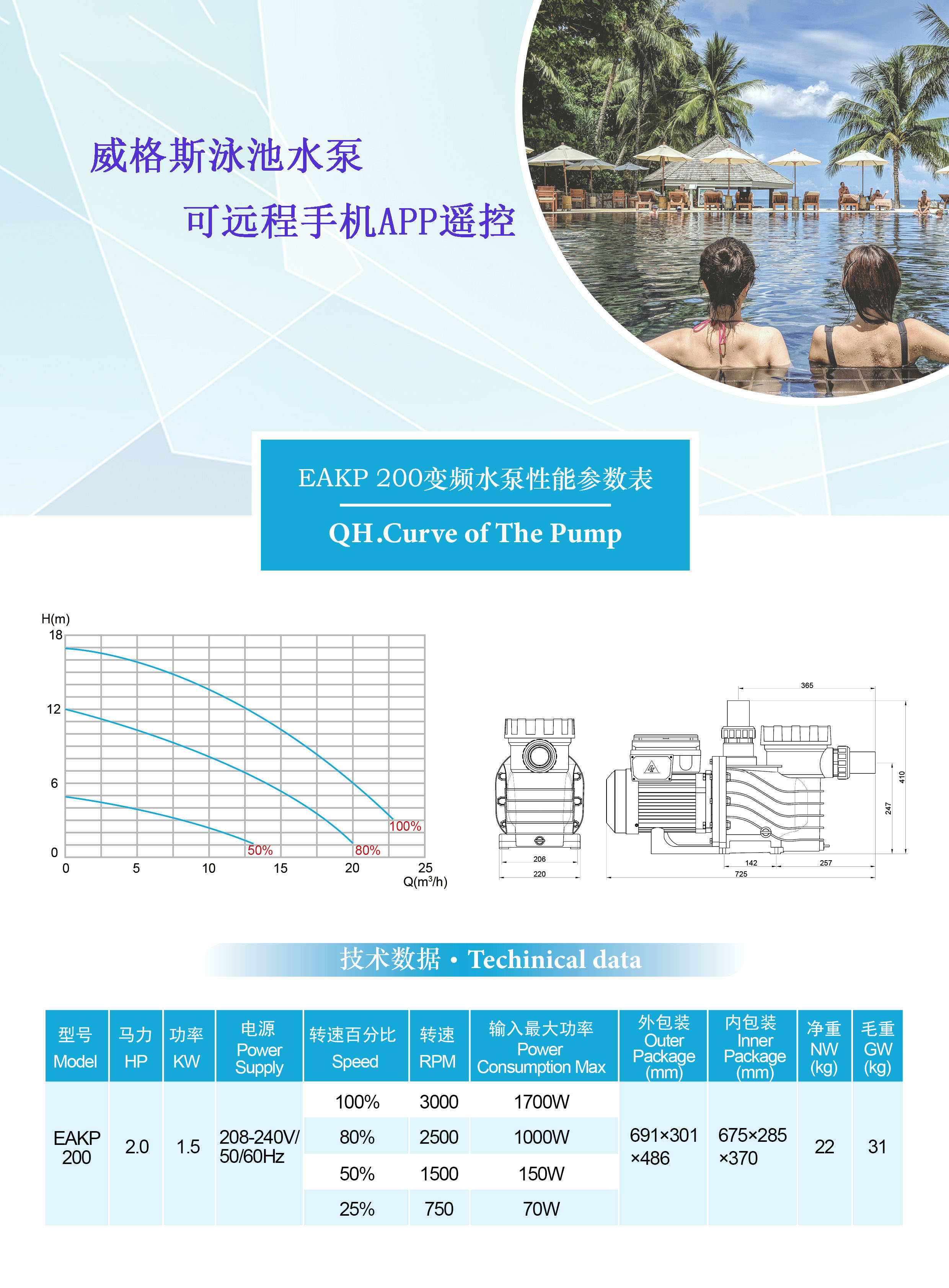 这款高效、经济、智能、可靠的变频水泵将广泛使用于游泳池、水疗中心、瀑布和园林水景。因为它提供给了极高的 适应性以及高效率和低开销的维护成本,是的节能解决方案!
