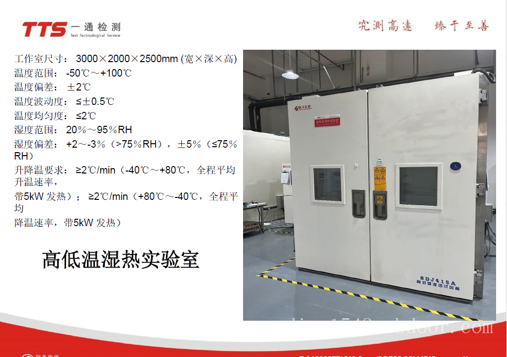 [项目详细介绍]在自然环境中,温度和湿度是不可分割的两个自然因素,不同地区由于不同的地理位置,产生的温度、湿度效应也各不相同。例如我国北方地区冬天是低温低湿的环境,而南方地区的夏天是高温高湿的环境。本试验是用来确认产品在温湿度气候环境条件下储存、运输、使用的适应性。试验的严苛程度取决于高/低温、湿度和曝露持续时间。TTS实验室提供多台不同尺寸的常规恒温恒湿箱与步入式恒温恒湿箱,根据不同类型的产品,为您提供测试服务。参考的测试标准:GB/T 2423.3,IEC 60068-2-78,GB/T 2423.4,IEC