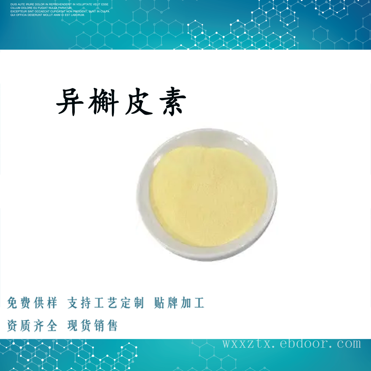 【产品名称】异槲皮素 【英文名称】Isoquercitrin 【产品别名】槲皮素-3-O-葡萄糖苷;异槲皮素,罗布麻甲素 【外观状态】浅黄色至黄色粉末 【产品规格】95%~98% 【检测方法】HPLC 【产品来源】槐米 【C A S 号】482-35-9 【分 子 式】C21H20O12 【分 子 量】464.38 【过筛目数】95%过80目筛 【保存方法】在干燥、阴凉、通风良好的地方密封遮光保存