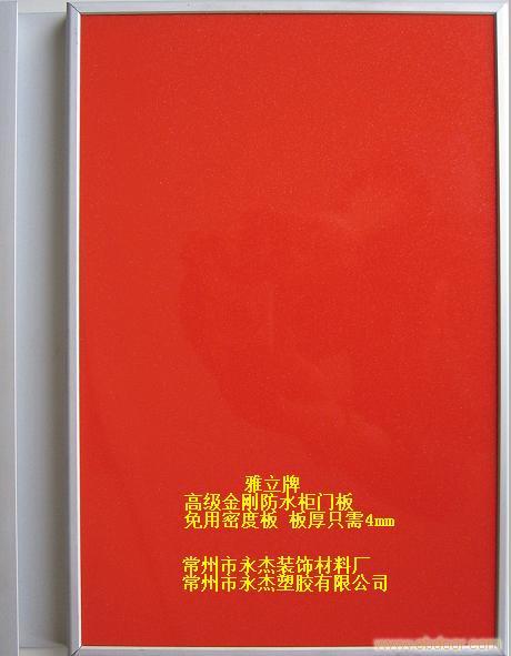 常州市永杰装饰材料厂生产的EOP特种金刚柜门板是一款代替钢化玻璃贴膜工艺的一代产品,完全避免了外出加工贴膜、玻璃钢化等繁琐程序和运输破损率高、贴膜起泡、交货期不稳定等诸多弊端。这种新型门板面如镜、硬如钢、耐酸碱、阻燃型(离火自息)、防霉变、防虫蛀、100%防水,有18种玻璃钢胶加工成的流行色(单色、闪点任意选择),板厚只需4.2-4.3mm,只要插在带有4.5mm槽口和转角件的铝合金封边框就能组成一个高贵华丽的柜门板,不用螺丝不用胶,四八尺大板裁切随心所欲、这种门板加工方便、操作简单、可锯可刨可钉可钻可粘。而且裁切下来的边料不要浪费,可以制作小样分发给你的分销商和客户。该新颖门板主要用于橱柜、衣柜、浴柜、书柜、隔断、场所装饰贴面之用,并能广泛用于化工、石油、电镀、矿山、医药、电子、通讯和水净化处理设备、环保设备等行业。总经理亲自掌控饰面设计、生产管理、成本控制。产品质量、价格均得到客户的一致认同和好评,使用该产品具有经久不衰的竞争力。欢迎来人来函洽谈,咨询敬请联系胡总  好产品尽在www.czyjzs.com