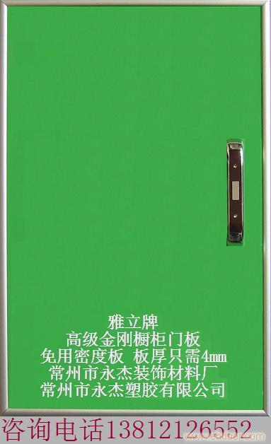 常州市永杰装饰材料厂生产的EOP特种金刚柜门板是一款代替钢化玻璃贴膜工艺的一代产品,完全避免了外出加工贴膜、玻璃钢化等繁琐程序和运输破损率高、贴膜起泡、交货期不稳定等诸多弊端。这种新型门板面如镜、硬如钢、耐酸碱、阻燃型(离火自息)、防霉变、防虫蛀、100%防水,有18种玻璃钢胶加工成的流行色(单色、闪点任意选择),板厚只需4.2-4.3mm,只要插在带有4.5mm槽口和转角件的铝合金封边框就能组成一个高贵华丽的柜门板,不用螺丝不用胶,四八尺大板裁切随心所欲、这种门板加工方便、操作简单、可锯可刨可钉可钻可粘。而且裁切下来的边料不要浪费,可以制作小样分发给你的分销商和客户。该新颖门板主要用于橱柜、衣柜、浴柜、书柜、隔断、场所装饰贴面之用,并能广泛用于化工、石油、电镀、矿山、医药、电子、通讯和水净化处理设备、环保设备等行业。总经理亲自掌控饰面设计、生产管理、成本控制。产品质量、价格均得到客户的一致认同和好评,使用该产品具有经久不衰的竞争力。欢迎来人来函洽谈,咨询敬请联系胡总  好产品尽在www.czyjzs.com