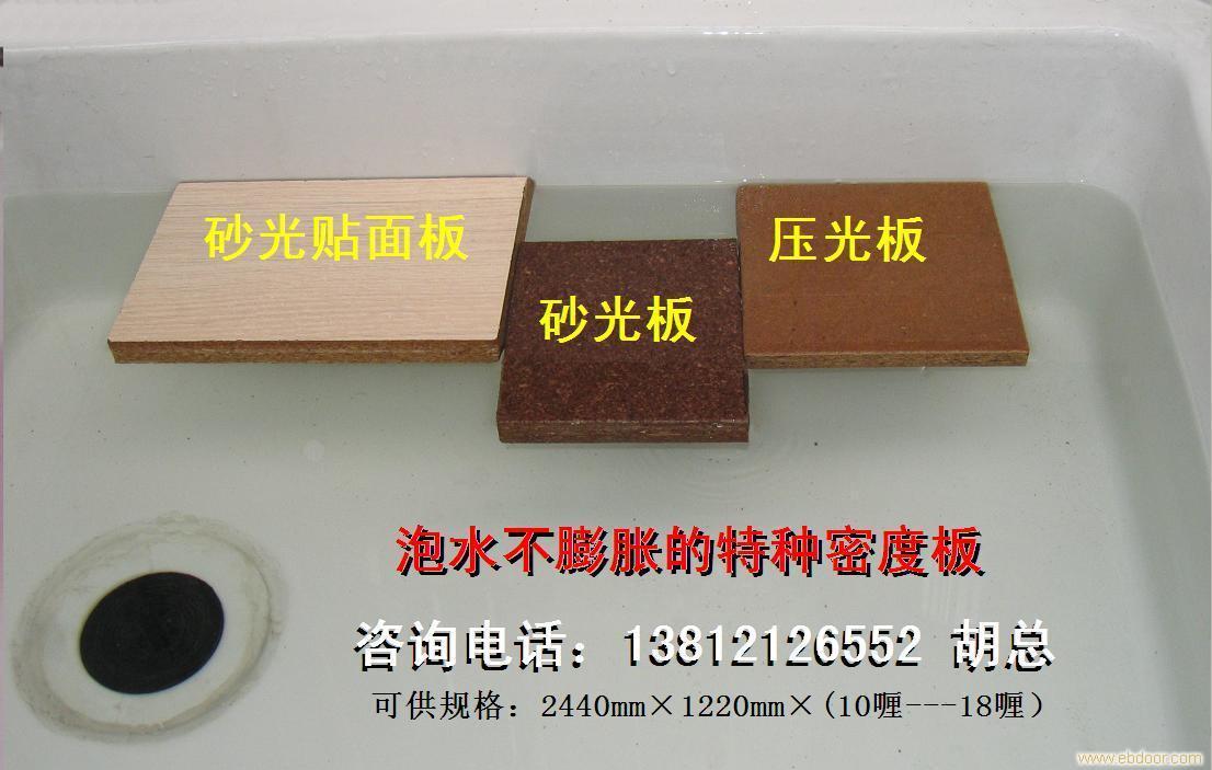 1、防潮密度板防潮功能特别强:可浸泡水中24小时才微涨15丝左右,干燥后基本会恢复原状,在洗浴中心、游泳馆、酒店厨房、单位食堂、化工车间、水族企业等空气湿度较大的场所装饰使用更显其优。
