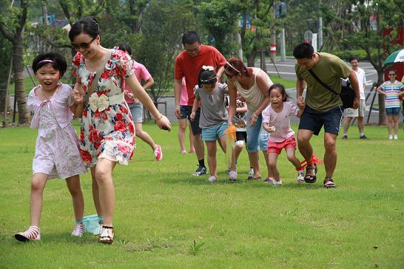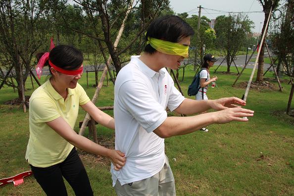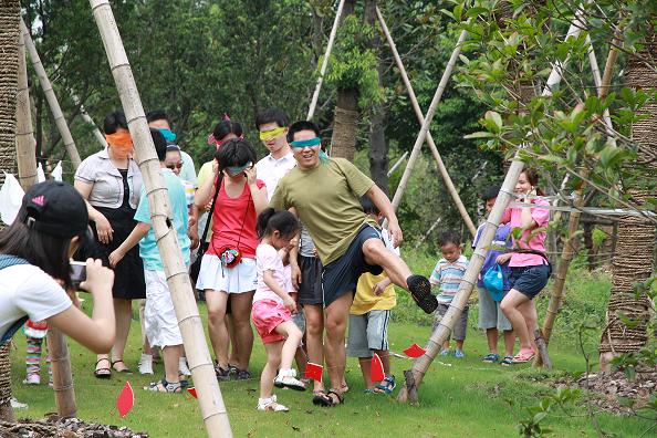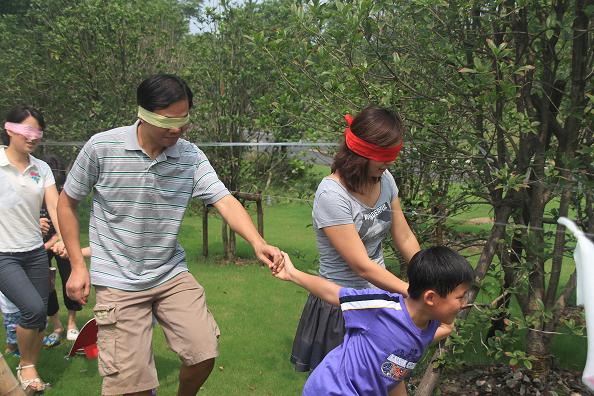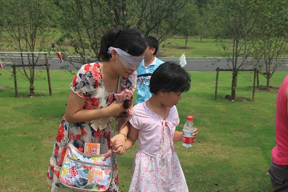 首先是热身游戏,导盲竞技。平时都是爸爸妈妈指导孩子怎么做,今天小鬼要当家,孩子指导蒙着眼睛的父母穿过障碍重重的树林,看看哪家先到目的地。每个人的成长道路都不可能是一帆风顺的,就像我们今天给大家布置的荆棘道路,我们希望通过这样的亲子游戏活动,增进亲子感情,同时也希望通过今天小鬼当家这样的游戏活动,能让小朋友体会到“引领”的重要性,能够体会到爸爸妈妈平日对自己呵护的不易。一定要好好学习,天天向上哦!