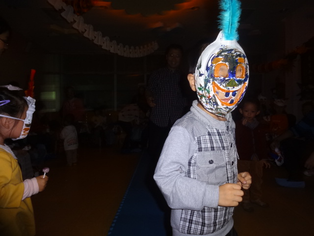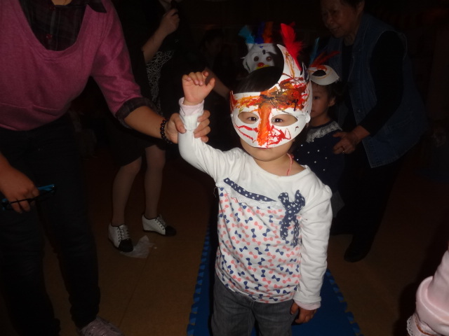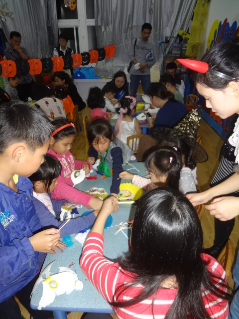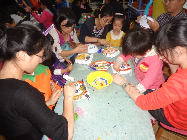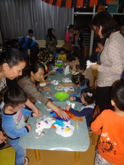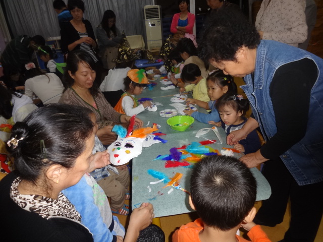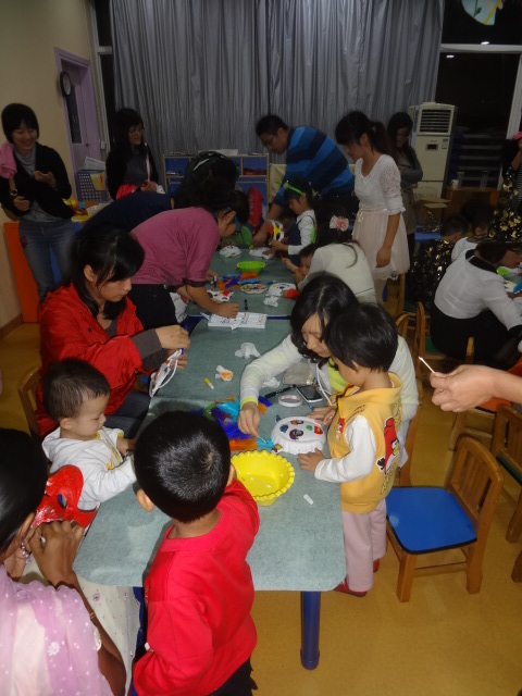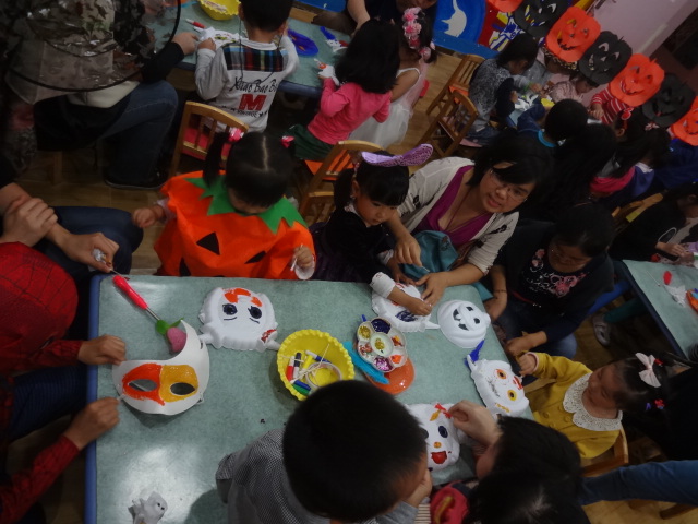 三、 啊哈,一个个这么忙碌是在干嘛呢?又是颜料又是羽毛的摆弄什么呀?想想今天的Party主题吧——happy Halloween!哪能少得了化妆舞会?这不正忙着准备吗?