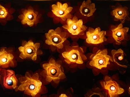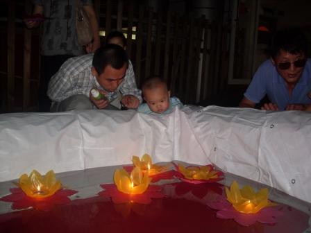 我们做的荷花灯漂亮吗? 哦,荷花灯飘来了