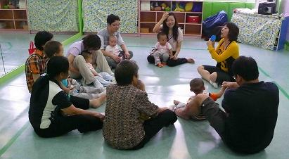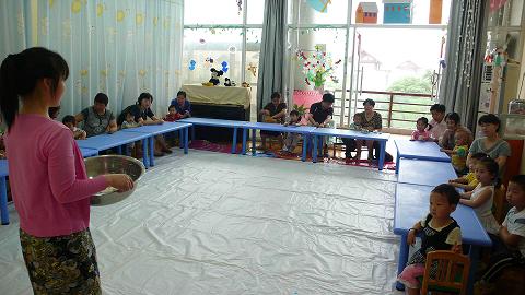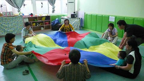 另外两个教室孩子们的游戏也在快乐的进行着,1岁半以下的小宝宝跟爸爸妈妈一起做:跳起来、贪吃的小猪、和妈妈一起做、钉马掌的亲子游戏,宝宝和爸爸妈妈都乐在其中。宝宝们的小手永远都是闲不住的,抓通心粉、推不倒翁、将袜子套在小手上、塞球、对敲积木、拉震玩具,让小手快乐的动起来!彩虹伞游戏是宝宝们的了,在彩虹伞里躲猫猫、走时光隧道,宝宝们兴奋的尖叫起来!