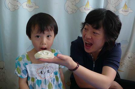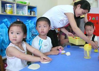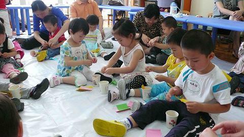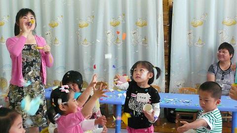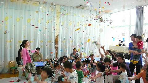 一岁半以上的大宝宝在大教室里做手工,用面团做小刺猬、汉堡包、蛋糕,孩子们忙得不亦乐乎!做完汉堡包闻一闻,哦,真香呀,真想吃一口!还有更好玩的呢,将彩纸撕成碎纸屑,比比看,看谁撕得快,撕得多,满地的碎纸屑,彻底满足了孩子们疯狂的欲望。用吹风机一吹,噢,彩纸屑飞起来了,老师好像懂孩子们的心思,锦上添花的吹起了泡泡,七彩的纸屑映着七彩的泡泡,就象孩子们此刻的心情,快乐飞扬!