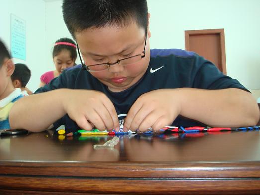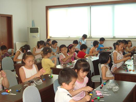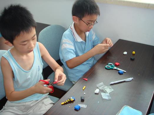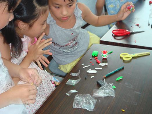 7月29日,晴空万里,正是三伏天,气温很高。张江汤臣豪园二期晨晖路居委的多功能教室内小朋友们的热情也象三伏天的气温一样高涨。小朋友正在用软陶创作。