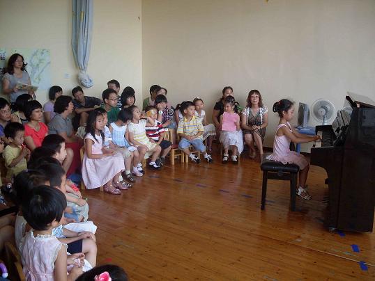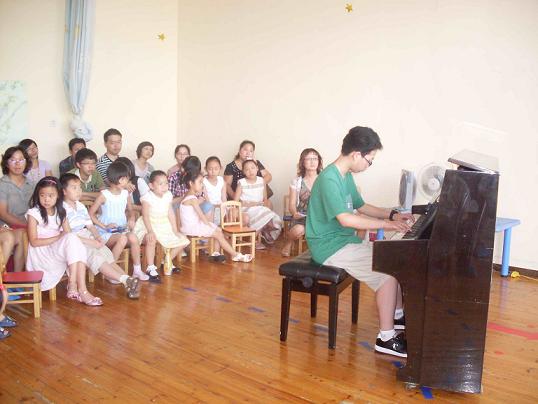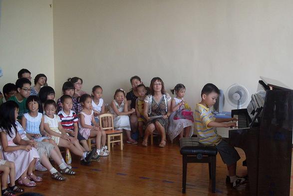 音乐会的开场节目是钢琴启蒙班的孩子们的儿歌表演唱《小星星》,他们稚嫩的歌声,可爱的动作让观众们忍俊不止,虽然动作不是十分整齐划一,但孩子们的认真和热情感染了家长,还是赢得了满场的掌声。接下来是哥哥姐姐们的钢琴独奏了。他们最小的6岁,钢琴学习了2年,即将考2级,的15岁,已经在去年考过了10级。他们都很喜欢弹钢琴,刚上场时虽然有点紧张,但是手一接触到琴键就恢复了自信。随着手指娴熟的跳动,动听的音乐就如流水般潺潺的流淌出。每个孩子的演奏都赢得大家的掌声,连钢琴启蒙班的3岁小小朋友都被钢琴曲吸引,一直坐到整场音乐会结束。