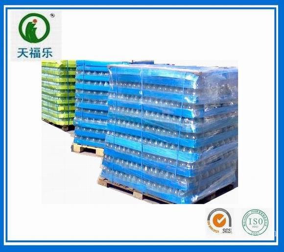 青岛天福乐塑胶有限公司是专业生产玻璃瓶托板的企业,其产品:玻璃瓶托板是配套于玻璃瓶托盘包装使用的。托盘包装是1000mm×1200mm或1100mm×1100mm的木托盘或塑料托盘上垫一片玻璃瓶托板,整齐排列好玻璃瓶,然后再放一片玻璃瓶托板,再放玻璃瓶。根据玻璃瓶的高度和运输的方式,按照玻璃瓶的存放场地来确定玻璃瓶包装的层数。便利在装车运输时叉车能顺利叉进装卸,待托盘上玻璃瓶高度固定后,用木盖板封顶,再用尼龙打包带或钢打包带打包固定。然后把固定好的托盘推到薄膜缠绕机前,自动缠绕塑料收缩膜,可根据玻璃瓶的形状或层数来确定塑料膜的缠绕层数。
